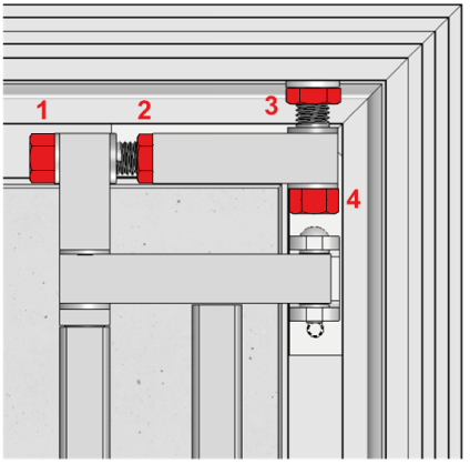 Для регулировки по горизонтали ослабить контргайку (позиция 2) на пару витков резьбы и отрегулировать регулировочным болтом (позиция 1).