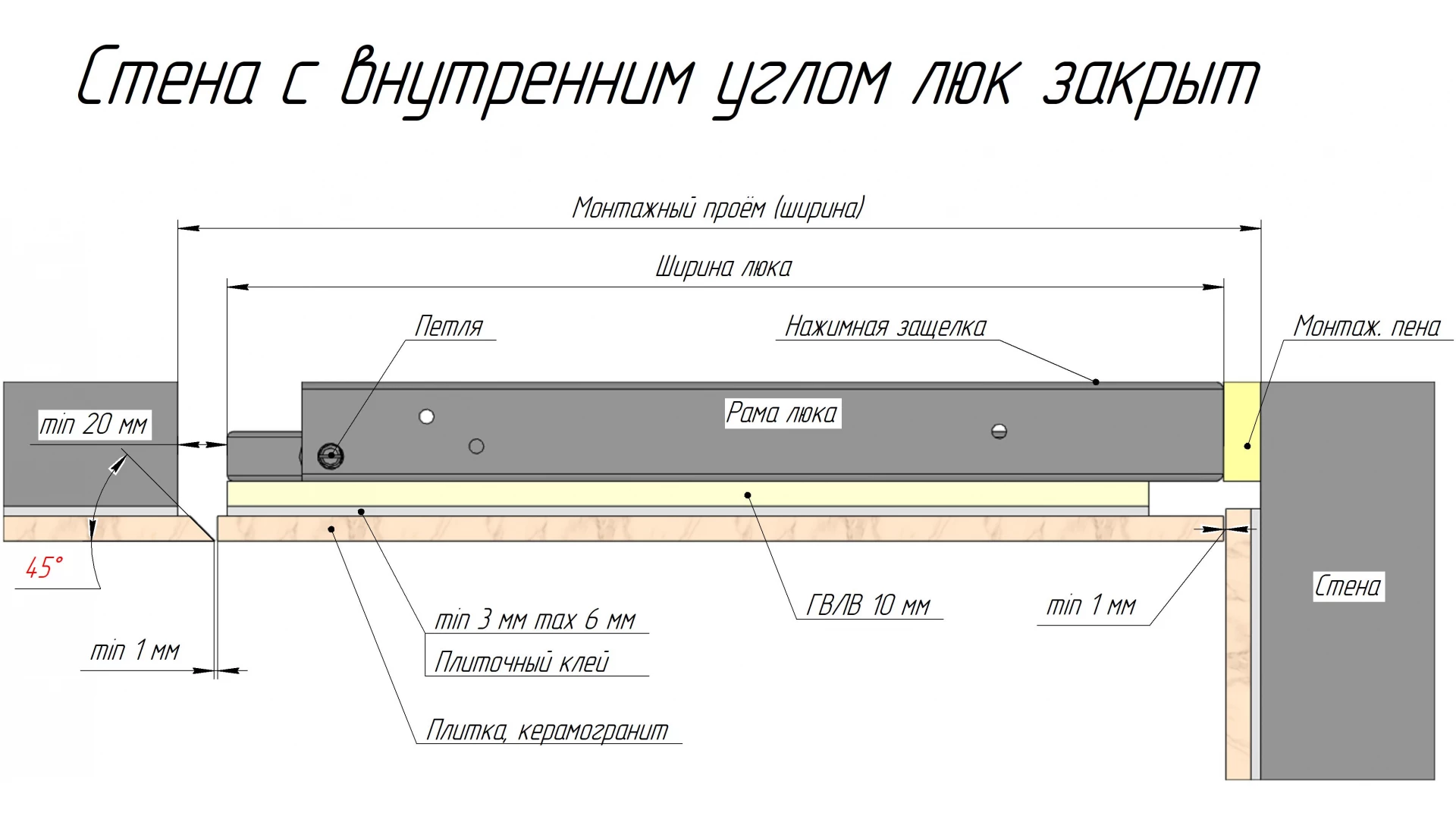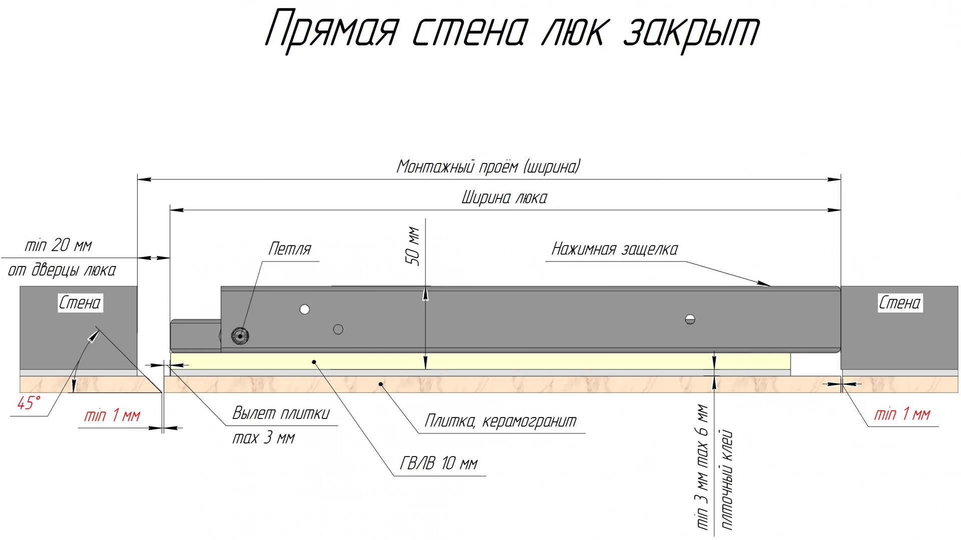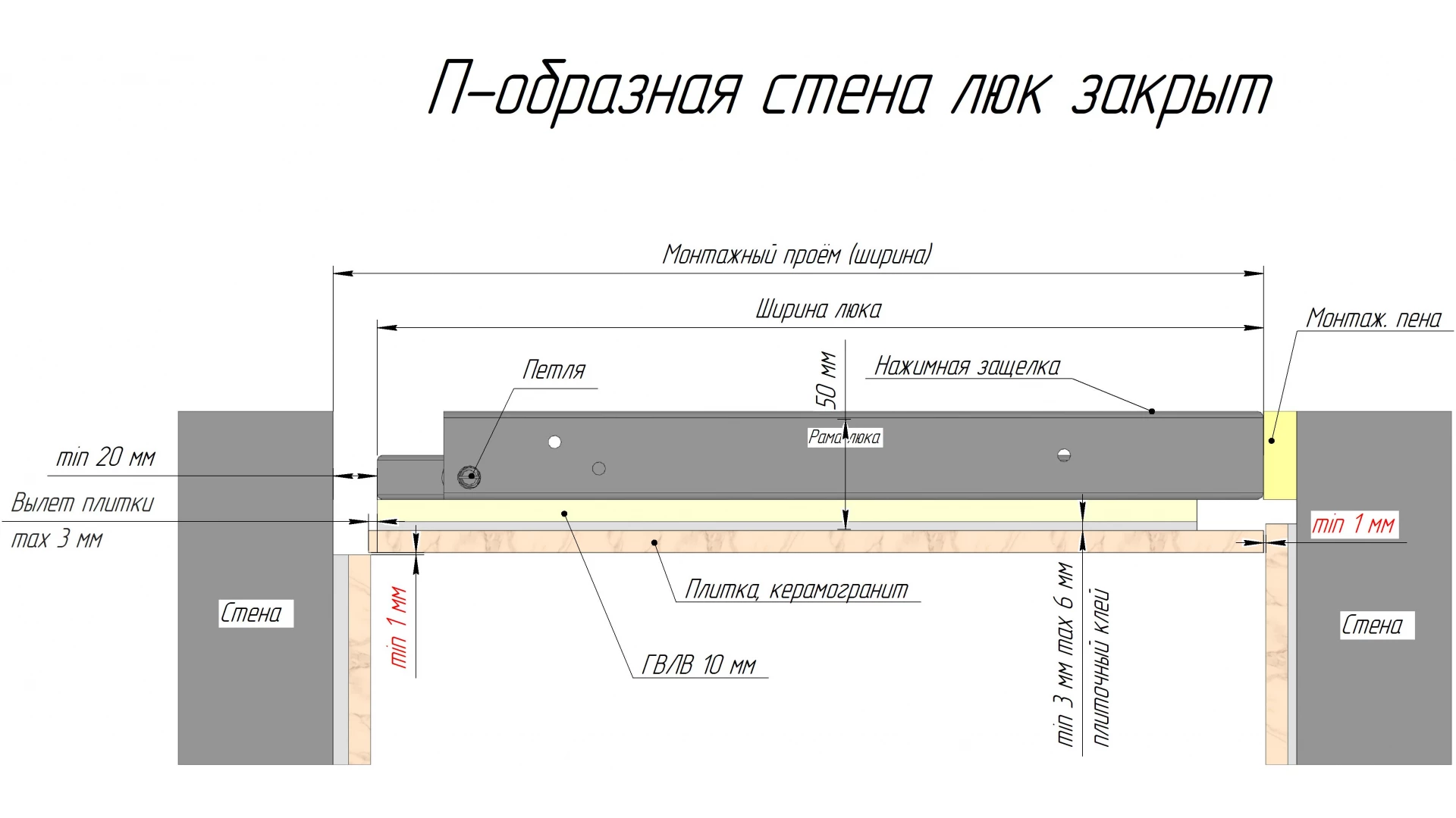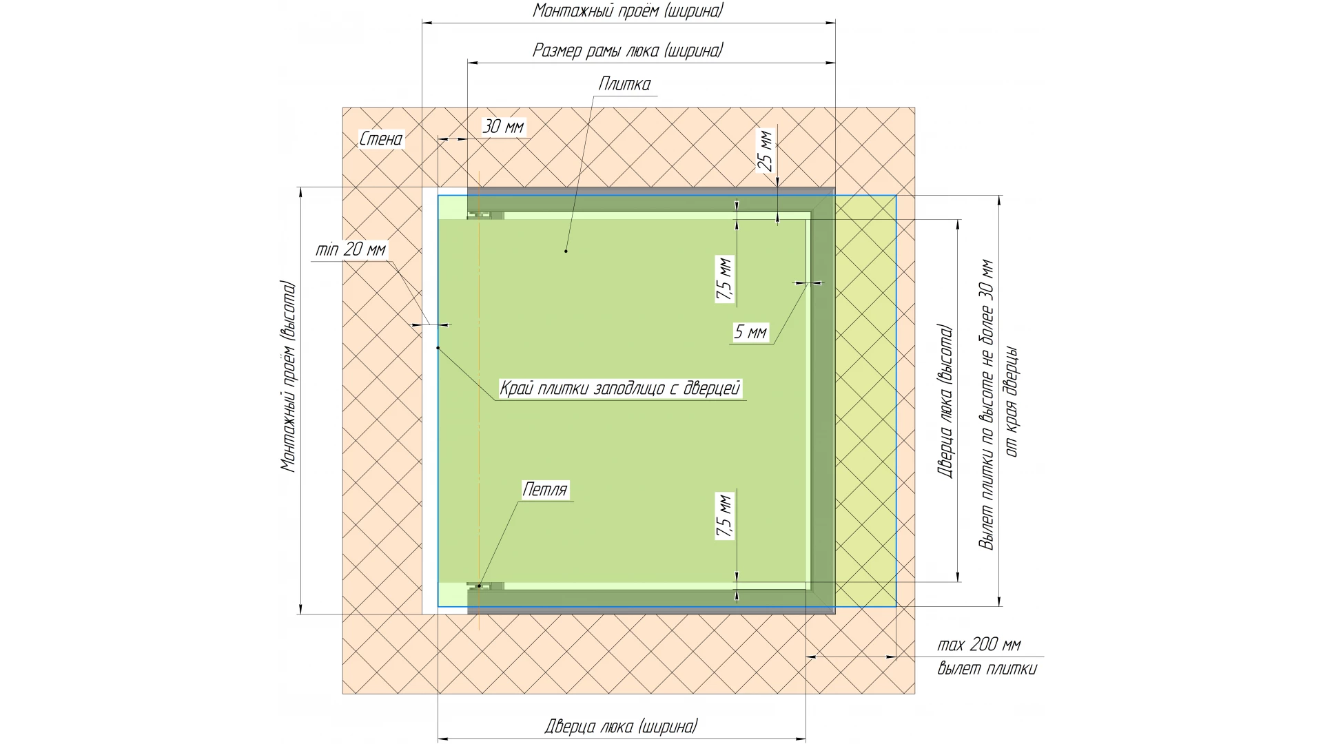 - Монтажный проём должен быть больше min. на 20 мм, больше чем фактический размер люка по ширине