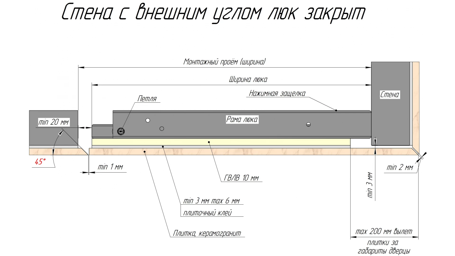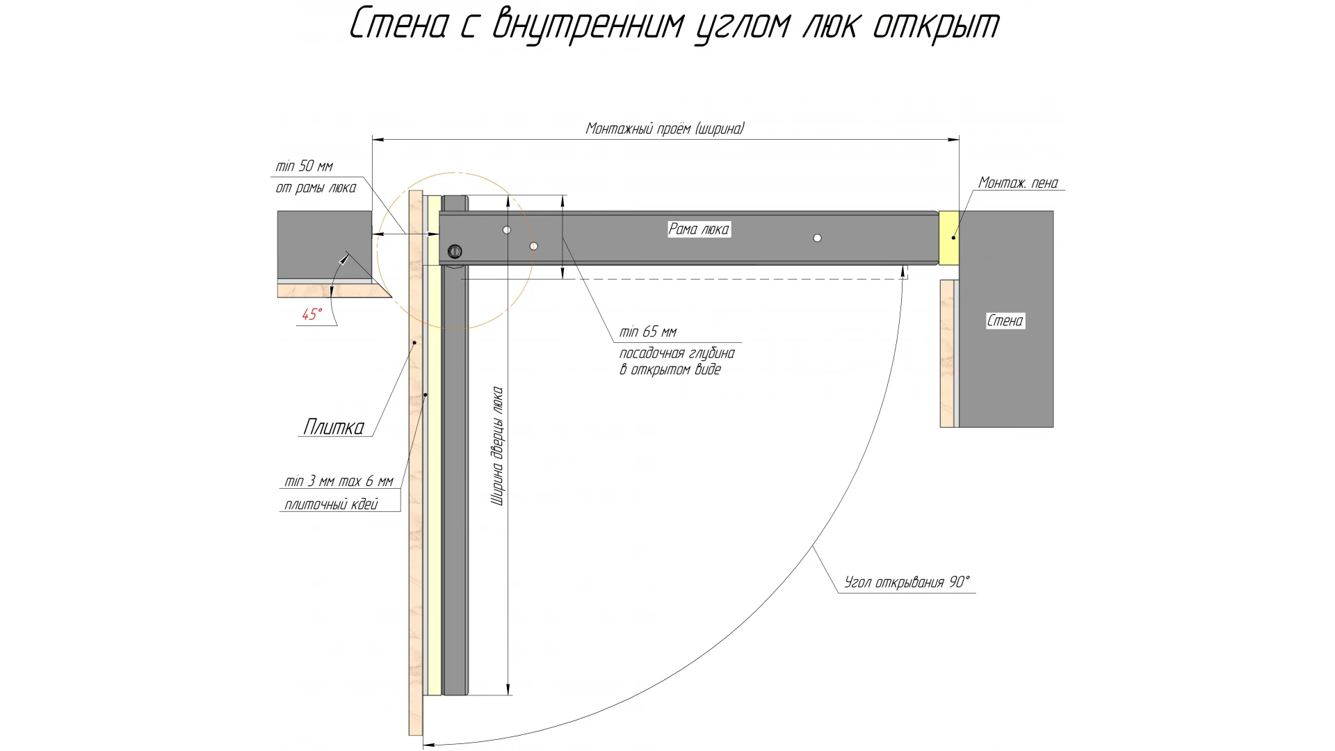 - Край плитки, прилегающий от стены к дверце люка со стороны петли должен быть подрезан под острым углом 45 градусов.